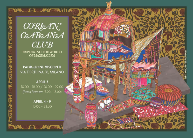 The Milan week of design will be the setting for a remarkable, never-before-seen exhibition: "CORIAN® CABANA CLUB." This must-see event proposes a multicultural and emotional journey into the world of Maximalism.