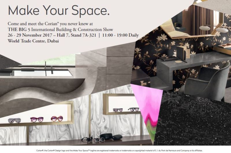 During the 2017 edition of The Big 5 International Building & Construction Show in Dubai (November 26-29), Corian® will present an inspiring selection of ideas for living and working with such a multi-talented material. At stand 7A-321, Hall 7, a series of displays and settings – residential kitchens, spa style bathrooms, hotel receptions, retail environments, restaurants – will showcase all the elegance, variety and versatility of the latest colours and shapes on offer from